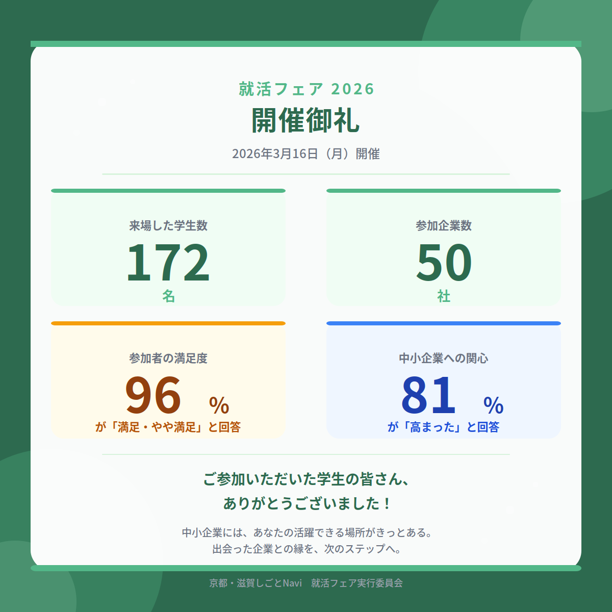 退場時のアンケートでは、参加者の 96% が「満足・やや満足」と回答。また 81% が「中小企業への関心が高まった」と答えており、京都・滋賀の中小企業の魅力が学生の皆さんに伝わった充実したイベントとなりました。